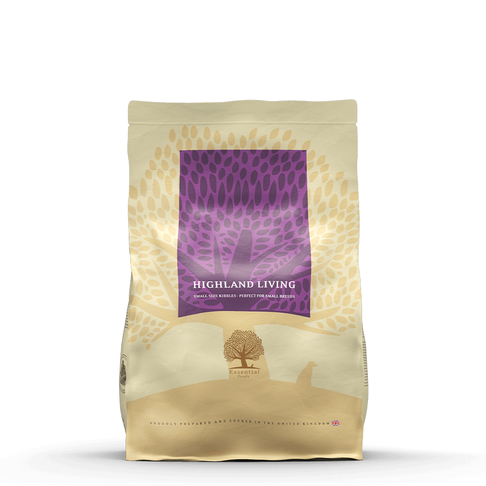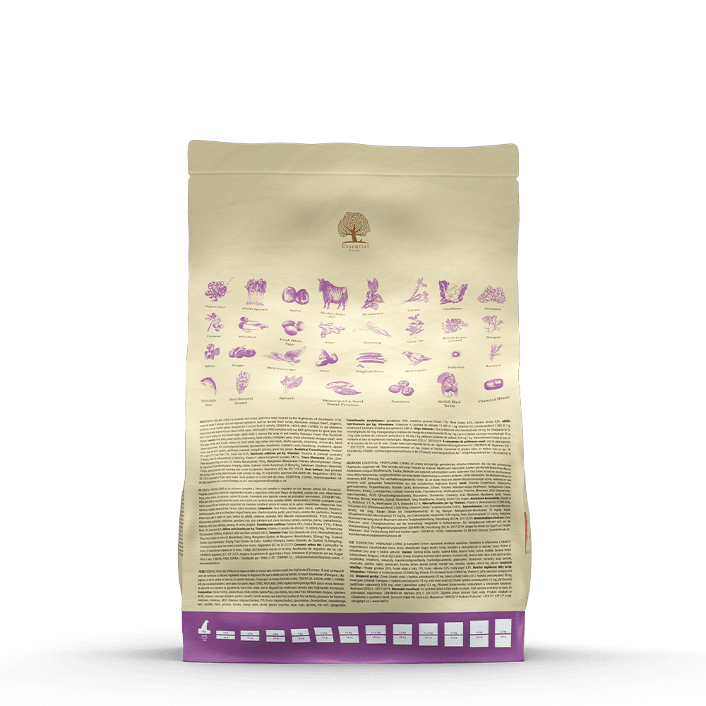 ESSENTIAL HIGHLAND LIVING este o hrană completă și unică, fără cereale, inspirată din regiunile muntoase ale Scoției. Este preparată cu o selecție generoasă de ingrediente locale și regionale delicioase, precum: