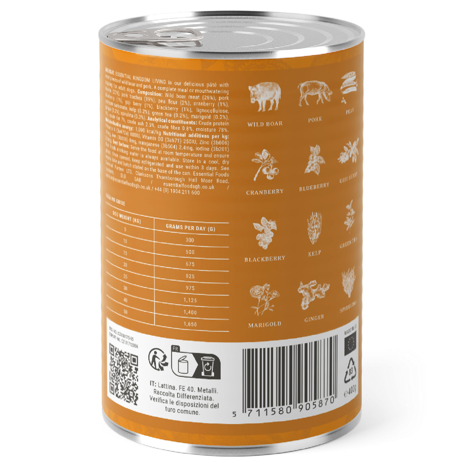 Essential Kingdom Living Pâté este o hrană umedă delicioasă cu bucăți de carne de mistreț și porc pentru câini adulți. Poate fi administrat ca masă completă, sau ca topper pentru hrana uscată.