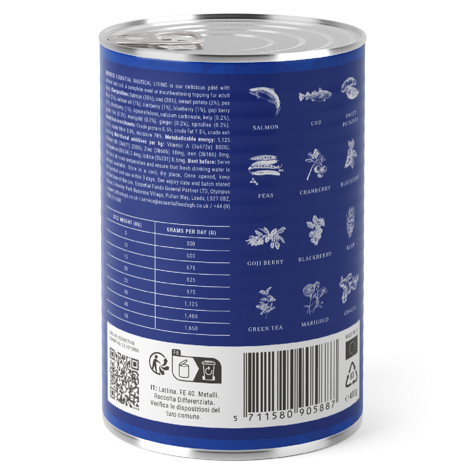 Essential Nautical Living Pâté este o hrană umedă delicioasă cu somon și cod pentru câini adulți. Poate fi administrat ca masă completă, sau ca topper pentru hrana uscată.