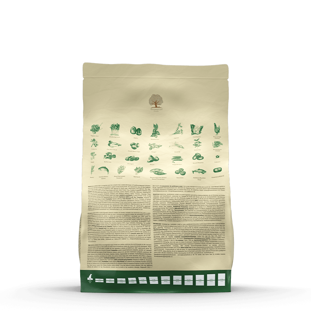 SUPERIOR LIVING este reteta grain free unica ESSENTIAL FOODS pe bază de pui și rață. Această hrană este perfectă pentru câini adulți de toate rasele cu un nivel obișnuit de activitate zilnică.