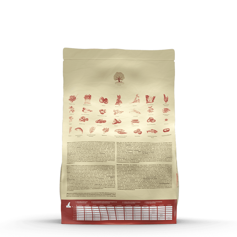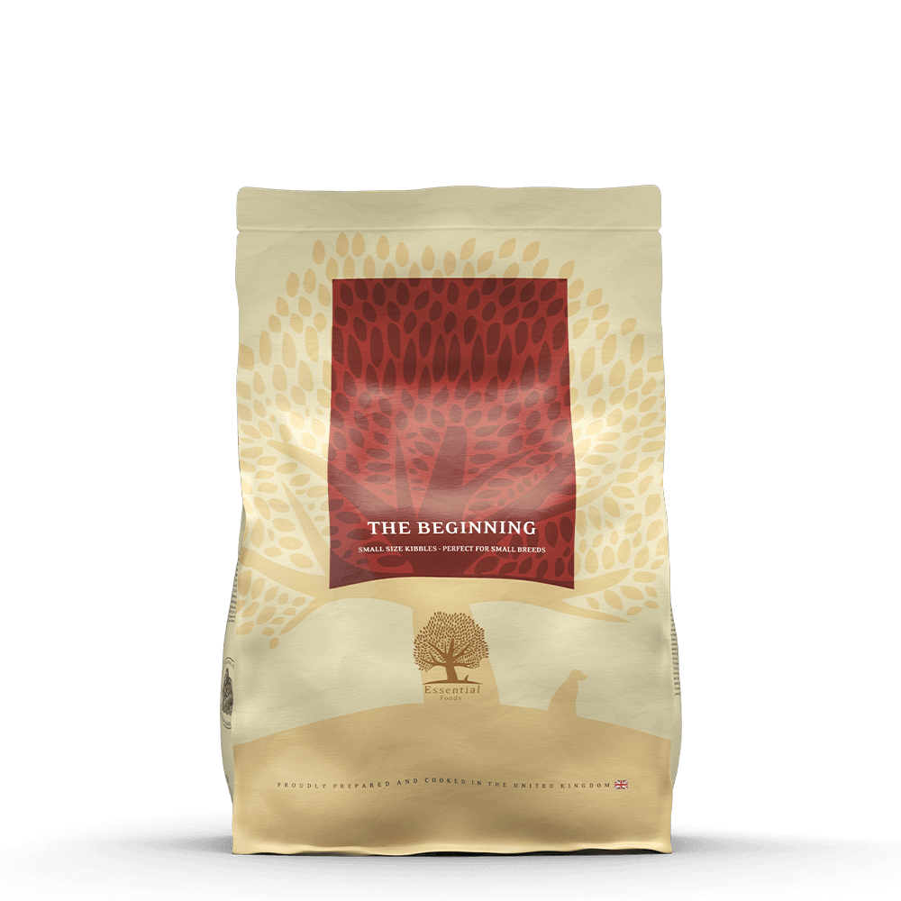 ESSENTIAL The BEGINNING este o hrană completă, fără cereale, special concepută pentru puii de câine care vor cântări până la 15 kg la maturitate. Este formulată cu ingrediente de cea mai bună calitate, precum: pui, rață, somon, păstrăv și ou – totul pentru a asigura o creștere sănătoasă și echilibrată.